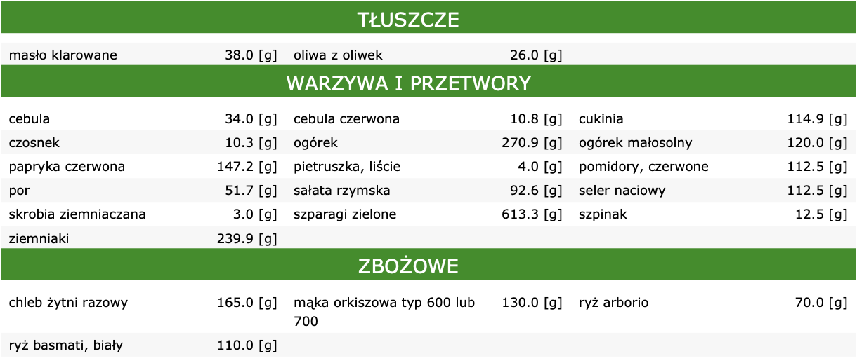 - jadłospis 3-dniowy zawierający 12 różnych posiłków: