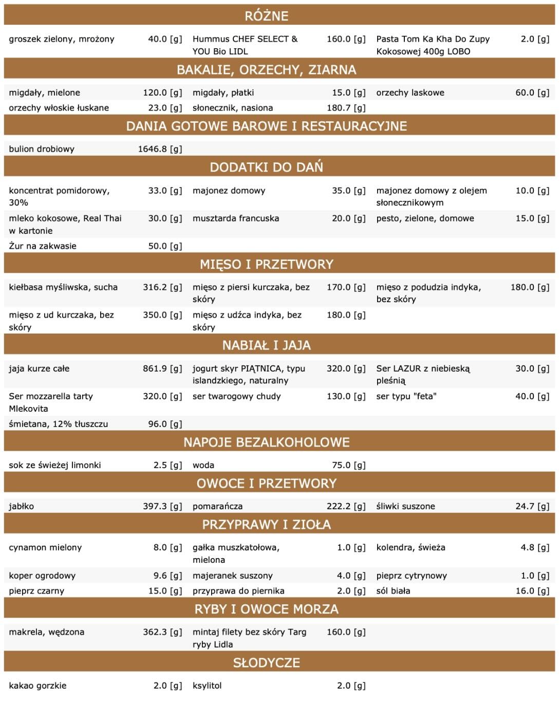 W diecie jest dołączona lista produktów użytych w diecie z ich właściwościami BTW i kalorycznością w 100g, co ułatwia ewentualne wymiany na inne produkty celem ewentualnego dostosowania potrawy do własnych preferencji.