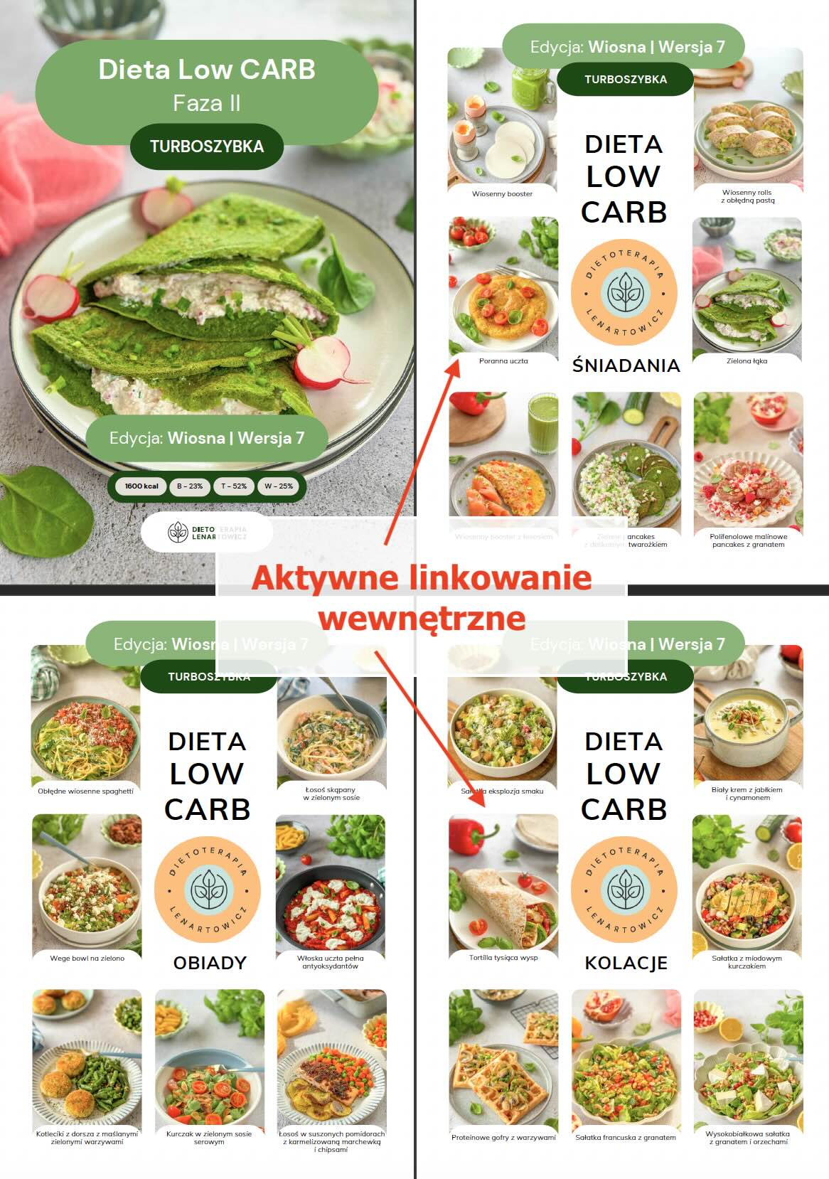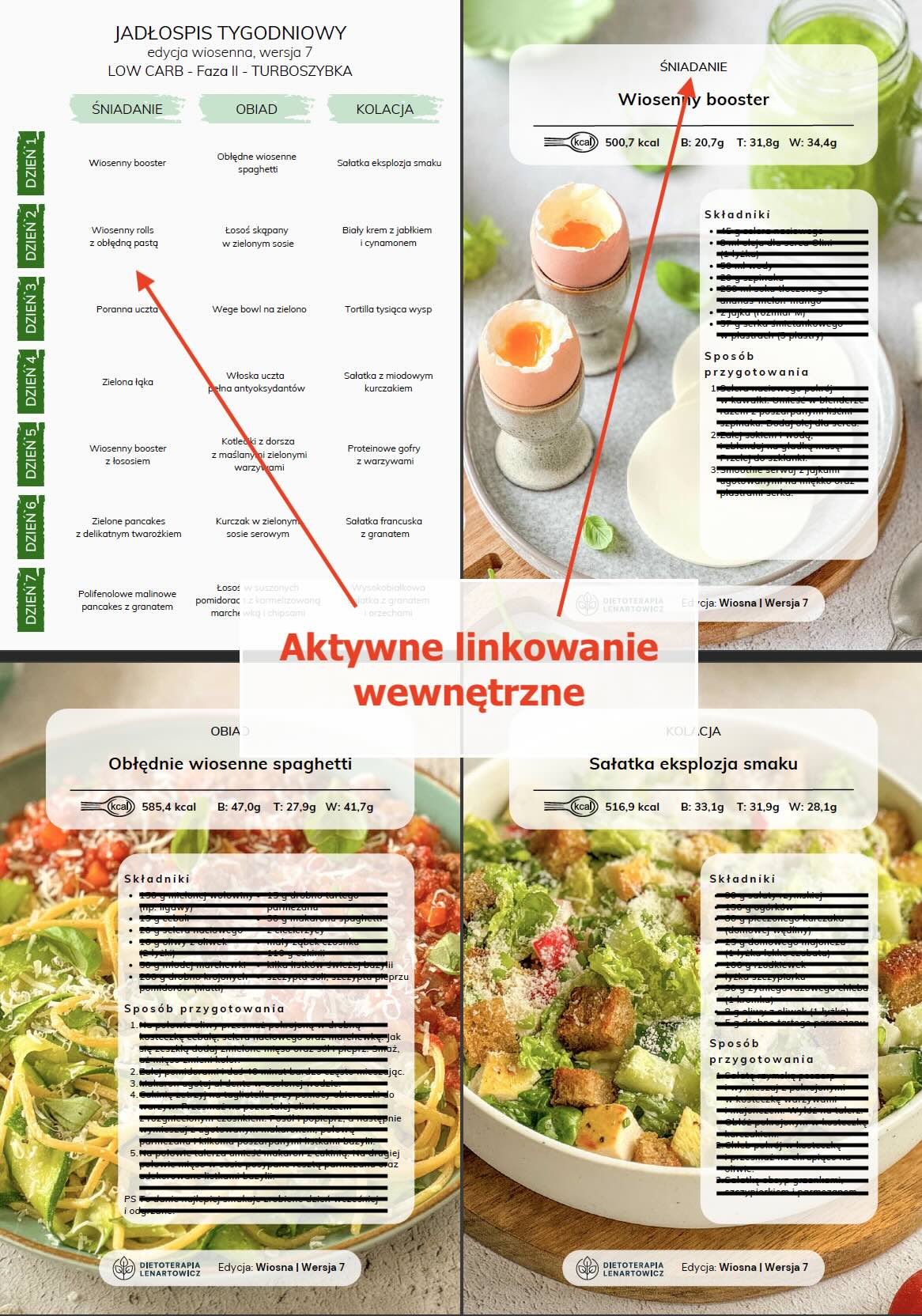 - MENU tygodniowe oraz ilustrowany spis potraw z aktywnym linkowaniem wewnętrznym powodującym, że po kliknięciu w nazwę potrawy czy zdjęcie następuje automatyczne przeniesienie do przepisu (nie trzeba scrollować),