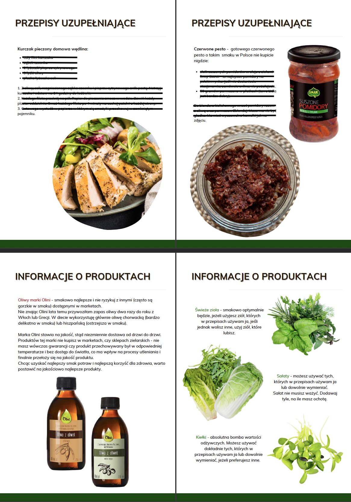 - kilkudziesięciostronicowy skrypt opisujący strategię LOW CARB, informacje o korzyściach płynących z jej stosowania oraz zalecenia, porady i niezbędne suplementacje,