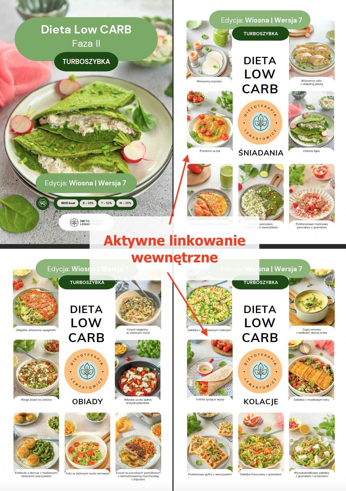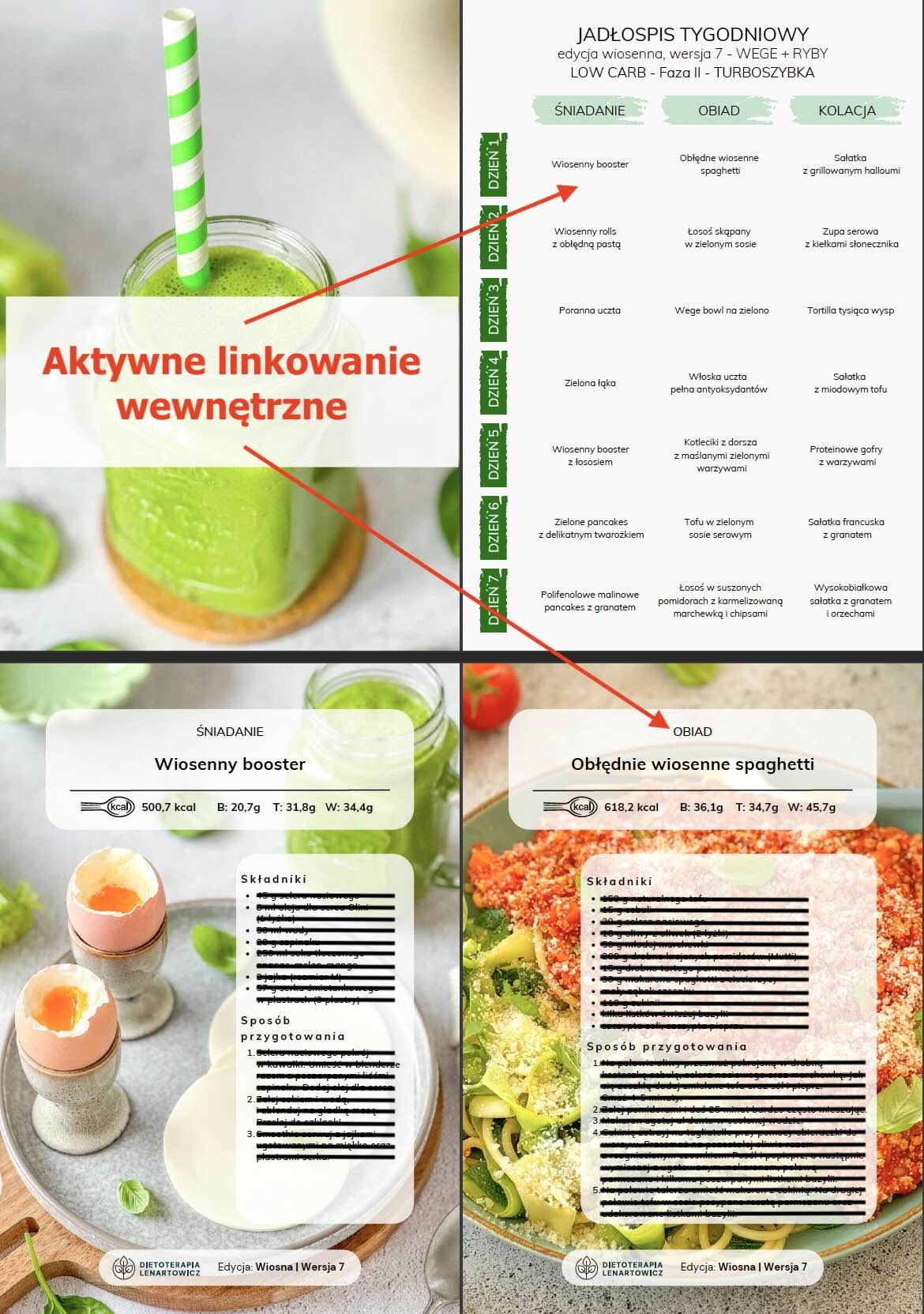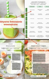 - MENU tygodniowe oraz ilustrowany spis potraw z aktywnym linkowaniem wewnętrznym powodującym, że po kliknięciu w nazwę potrawy czy zdjęcie następuje automatyczne przeniesienie do przepisu (nie trzeba scrollować),