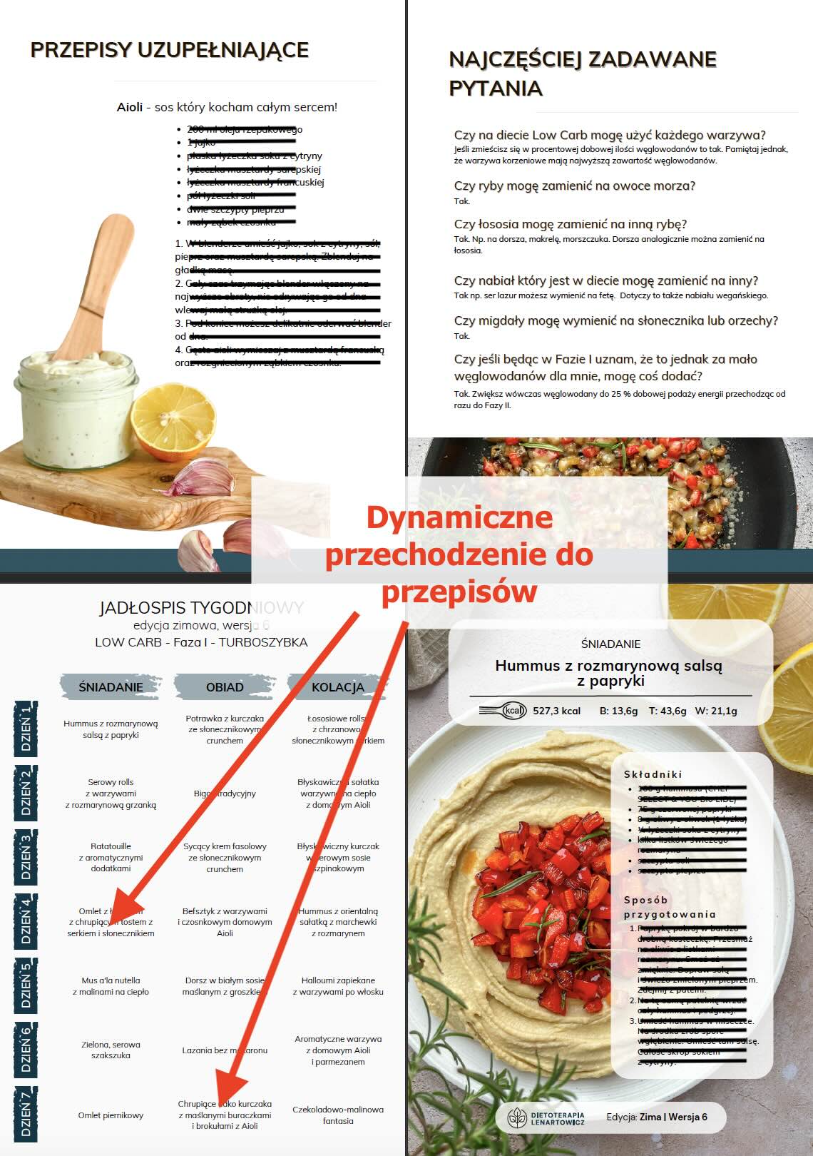 MENU tygodniowe oraz ilustrowany spis potraw z aktywnym linkowaniem wewnętrznym powodującym, że po kliknięciu w nazwę potrawy czy zdjęcie następuje automatyczne przeniesienie do przepisu (nie trzeba scrollować),