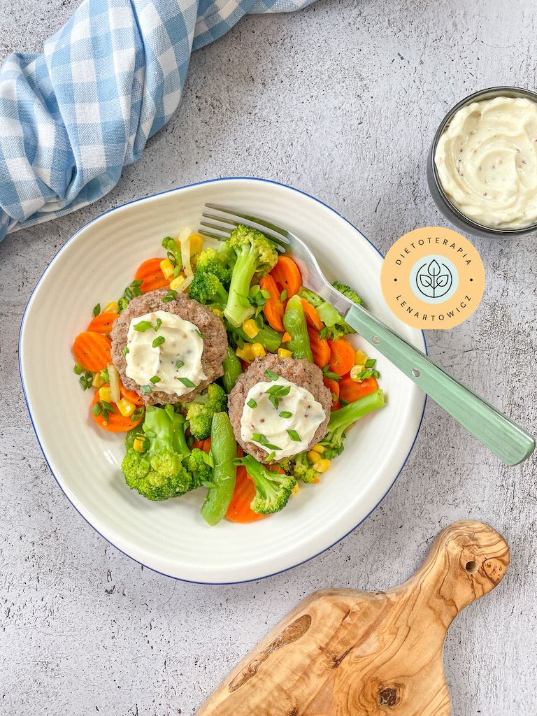 Befsztyk z warzywami i czosnkowym domowym Aioli