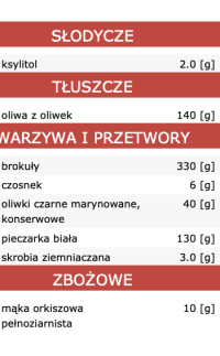Ilość posiłków dziennie - 3 Rozkład makro: 23% białka, 62% tłuszczu, 15% węglowodanów. Dieta posiada niski indeks i ładunek glikemiczny.