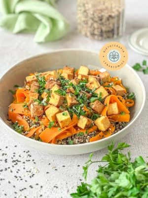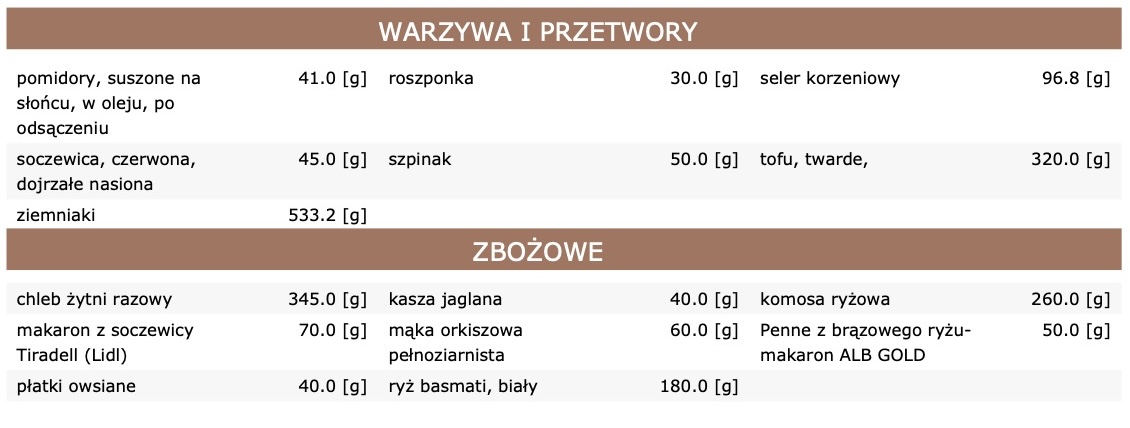 Kupując gotowy jadłospis wegetariański zwróćcie uwagę na tabele białek, tłuszczów i węglowodanów. Zobaczcie ile czego jest w konkretnych produktach. Ile czego być musi, aby dieta była dobrze zbilansowana.