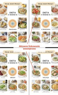 - MENU tygodniowe oraz ilustrowany spis potraw z aktywnym linkowaniem wewnętrznym powodującym, że po kliknięciu w nazwę potrawy czy zdjęcie następuje automatyczne przeniesienie do przepisu (nie trzeba scrollować),