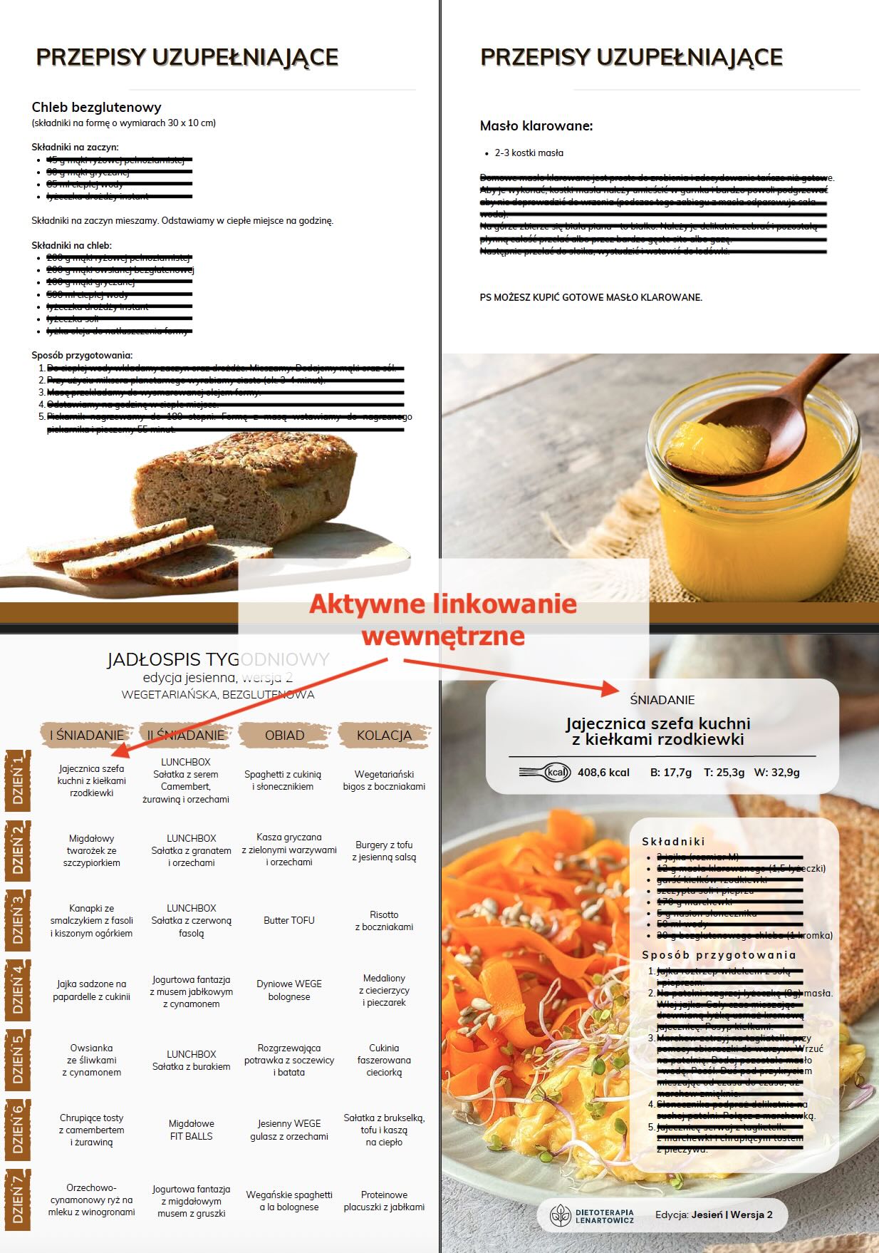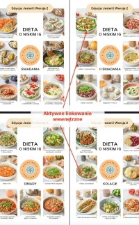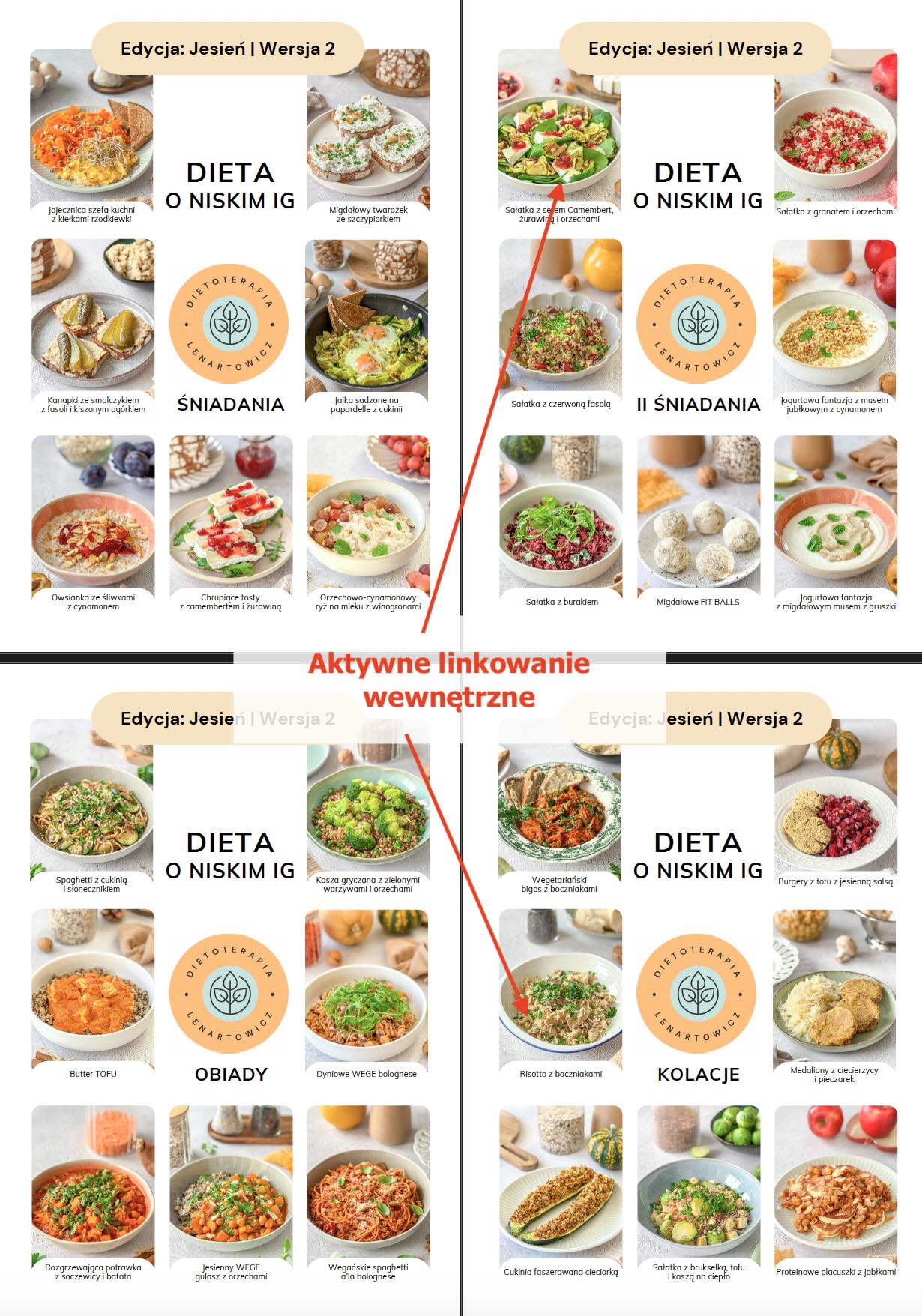 • MENU tygodniowe oraz ilustrowany spis potraw z aktywnym linkowaniem wewnętrznym powodującym, że po kliknięciu w nazwę potrawy czy zdjęcie następuje automatyczne przeniesienie do przepisu (nie trzeba scrollować),