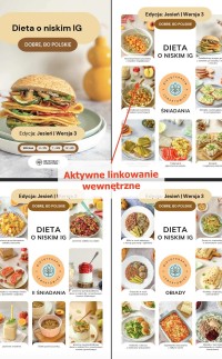 7-dniowy jadłospis o niskim indeksie glikemicznym, zawierający 28 różnych przepisów o niskim indeksie glikemicznym w tym: - 1, 3, 7 dzień - obiad z mięsem, - 2, 4, 6 dzień - obiad bez mięsa, - 5 dzień - obiad z rybą,