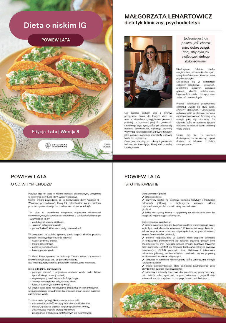 "Powiew lata" jest kontynuacją diety Wiosna 8 "Wiosenne przebudzenie", którą pokochaliście za to, co robi z Waszym ciałem, skórą i poziomem energii. To dieta o niskim indeksie glikemicznym, utrzymana w konwencji Low Carb (35% węglowodanów ). To dieta w sam raz na “obudzenie się” z zimowego snu, nasycenie organizmu witaminami, minerałami, antyoksydantami oraz składnikami o działaniu diuretycznym, aby “zrzucić” zatrzymaną wodę i poczuć się lekko. Dzięki zawartym w niej koktajlom bogatym w błonnik jest skutecznym środkiem w walce z wysokim poziomem cholesterolu. To, w połączeniu ze stabilną glikemią (brak nagłych skoków poziomu glukozy i insuliny) jaką zapewnia dieta, przekłada się na wzrost poziom energii, lepszą koncentrację, poprawę samopoczucia i brak napadów głodu, dzięki czemu łatwiej zrealizujesz cele zarówno zdrowotne, jak i sylwetkowe.