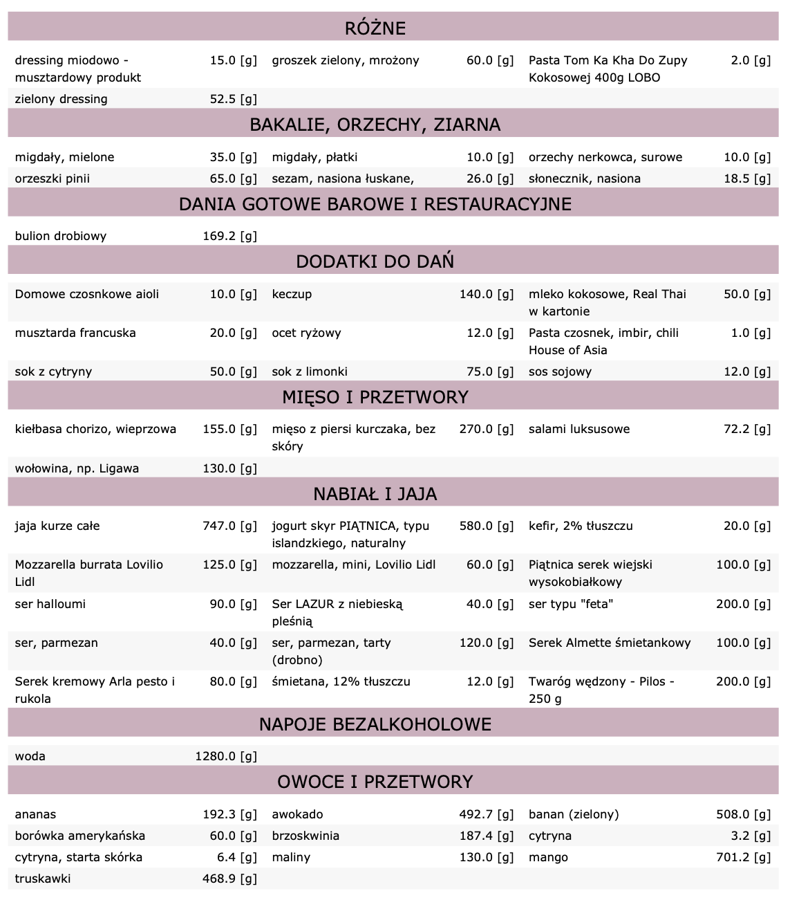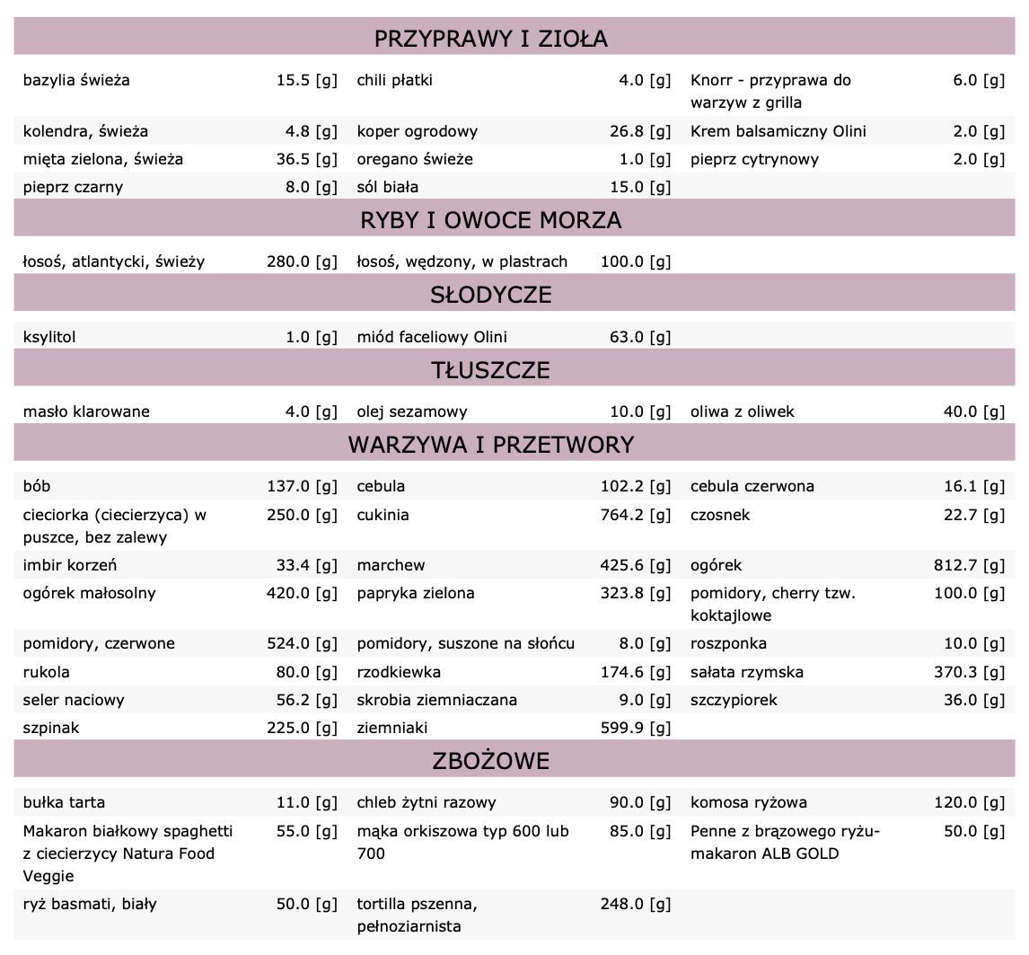Dieta zawiera 28 posiłków (7 dni, 4 posiłki dziennie):