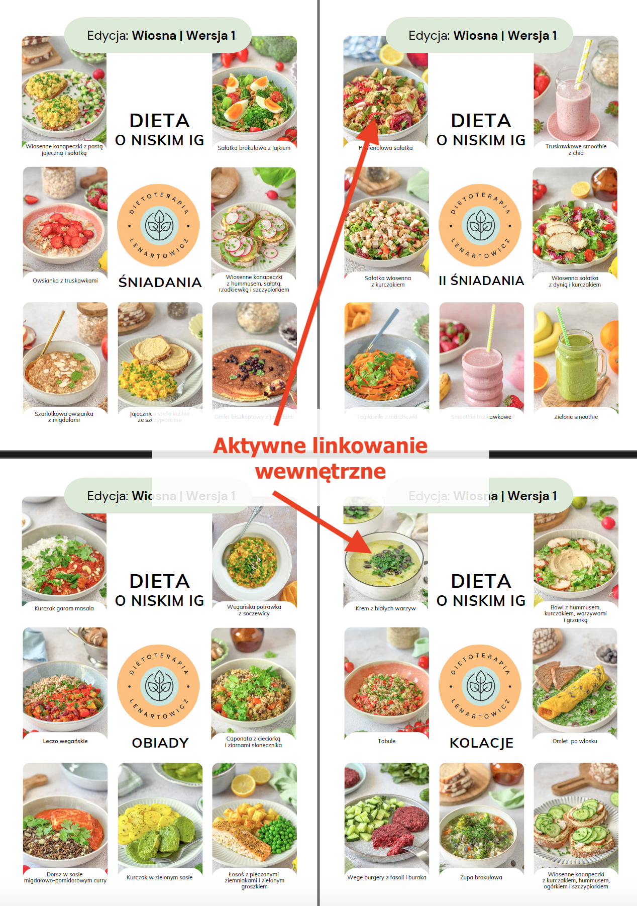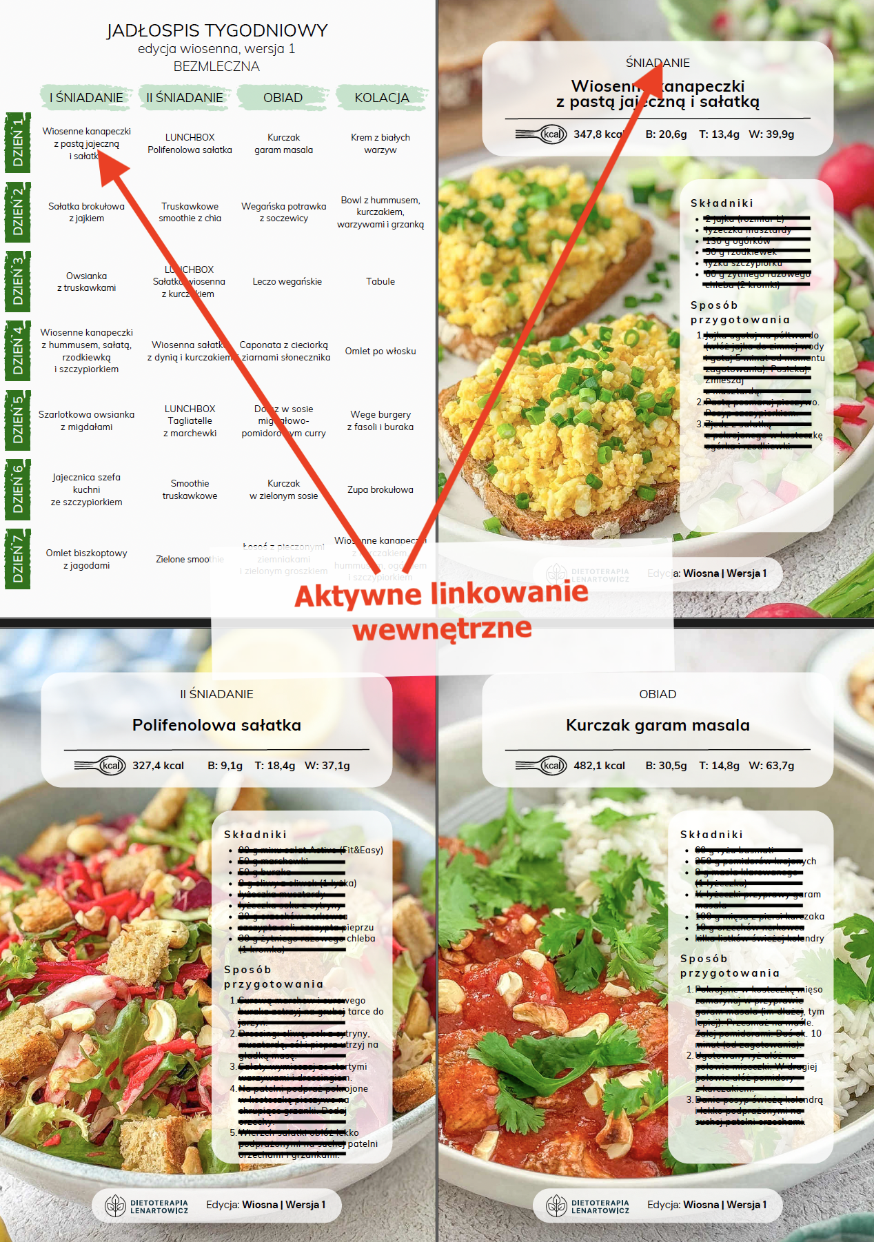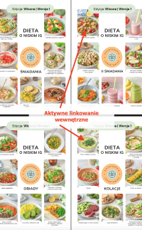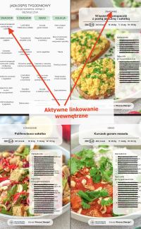 - MENU tygodniowe oraz ilustrowany spis potraw z aktywnym linkowaniem wewnętrznym powodującym, że po kliknięciu w nazwę potrawy czy zdjęcie następuje automatyczne przeniesienie do przepisu (nie trzeba przewijać),