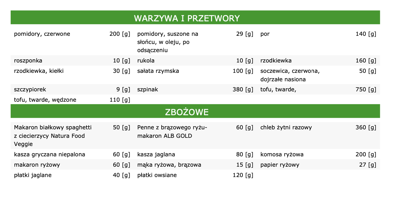 Kupując gotowy jadłospis wegański zwróćcie uwagę na tabele białek, tłuszczów i węglowodanów. Zobaczcie ile czego jest w konkretnych produktach. Ile czego być musi, aby dieta była dobrze zbilansowana.