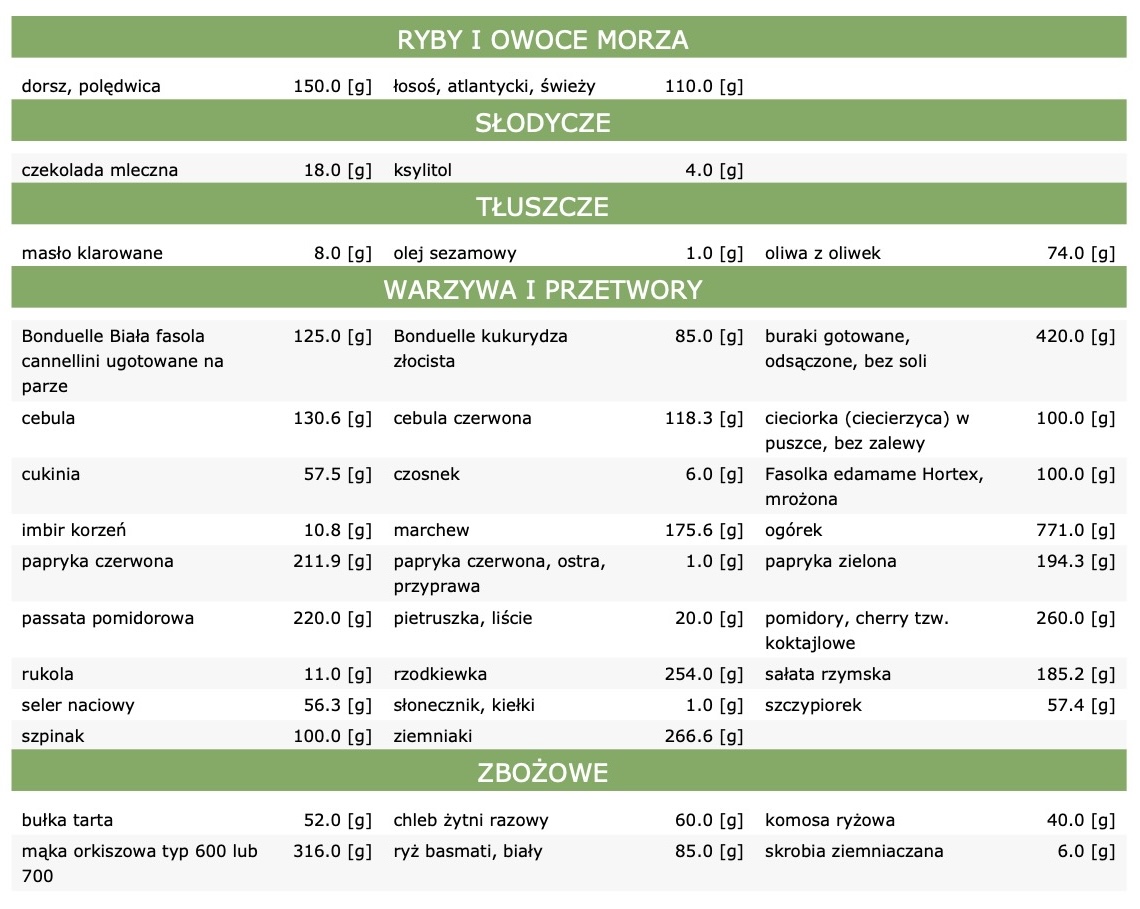 - informacje o gotowych produktach wykorzystanych w diecie,