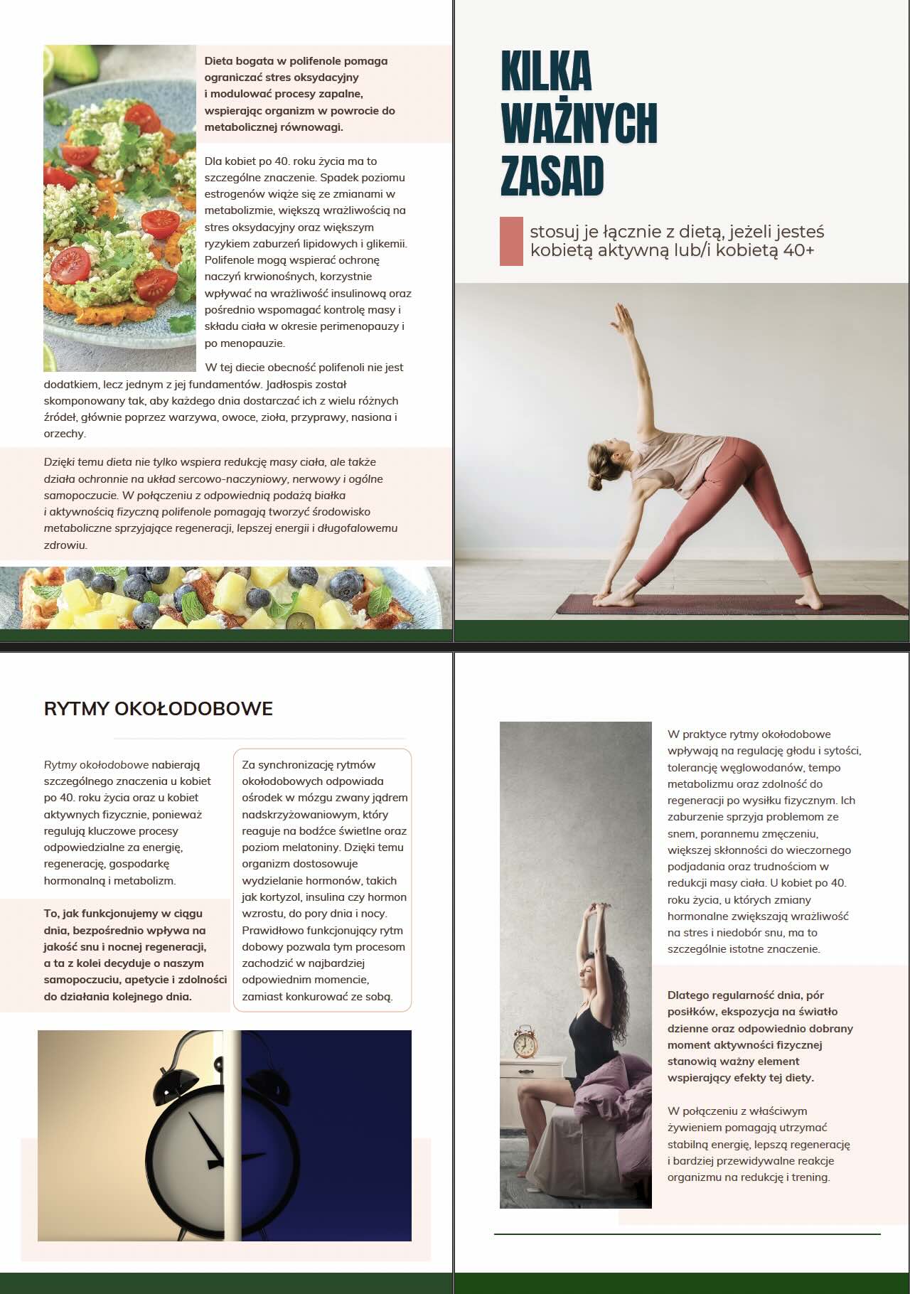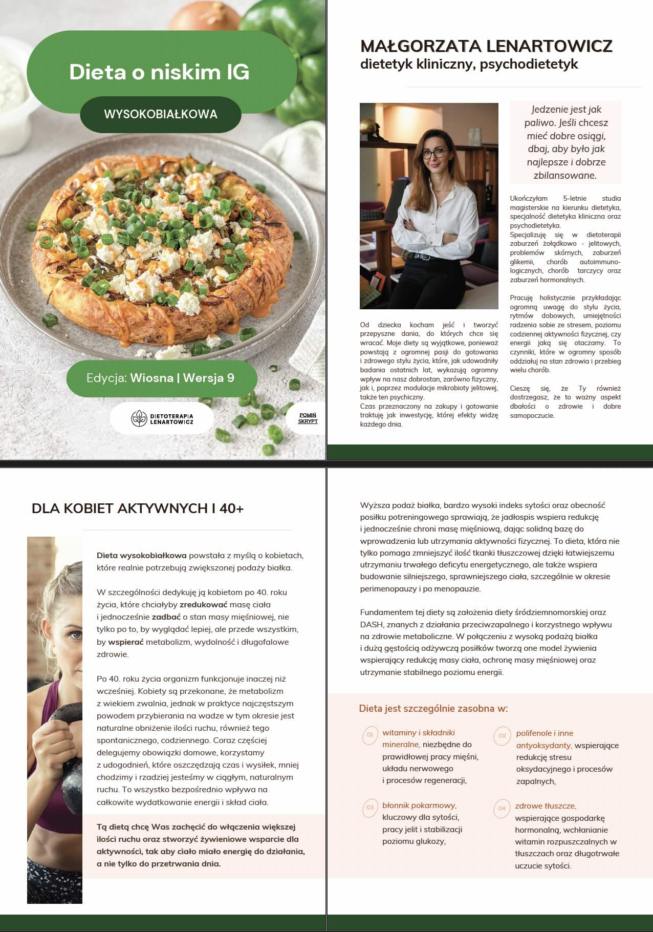 - skrypt edukacyjny, zawierający dużą dawkę wiedzy podanej w przystępny i uporządkowany sposób, dotyczącej m.in.: znaczenia podaży białka u kobiet aktywnych i po 40-tym roku życia, wpływu aktywności fizycznej i masy mięśniowej na metabolizm oraz skład ciała, roli rytmów okołodobowych w procesie redukcji, stabilizacji glikemii, sytości i poziomu energii w ciągu dnia, znaczenia diety przeciwzapalnej oraz kluczowe w tym okresie zasady spożywania posiłków, nawodnienia oraz zalecenia suplementacyjne.