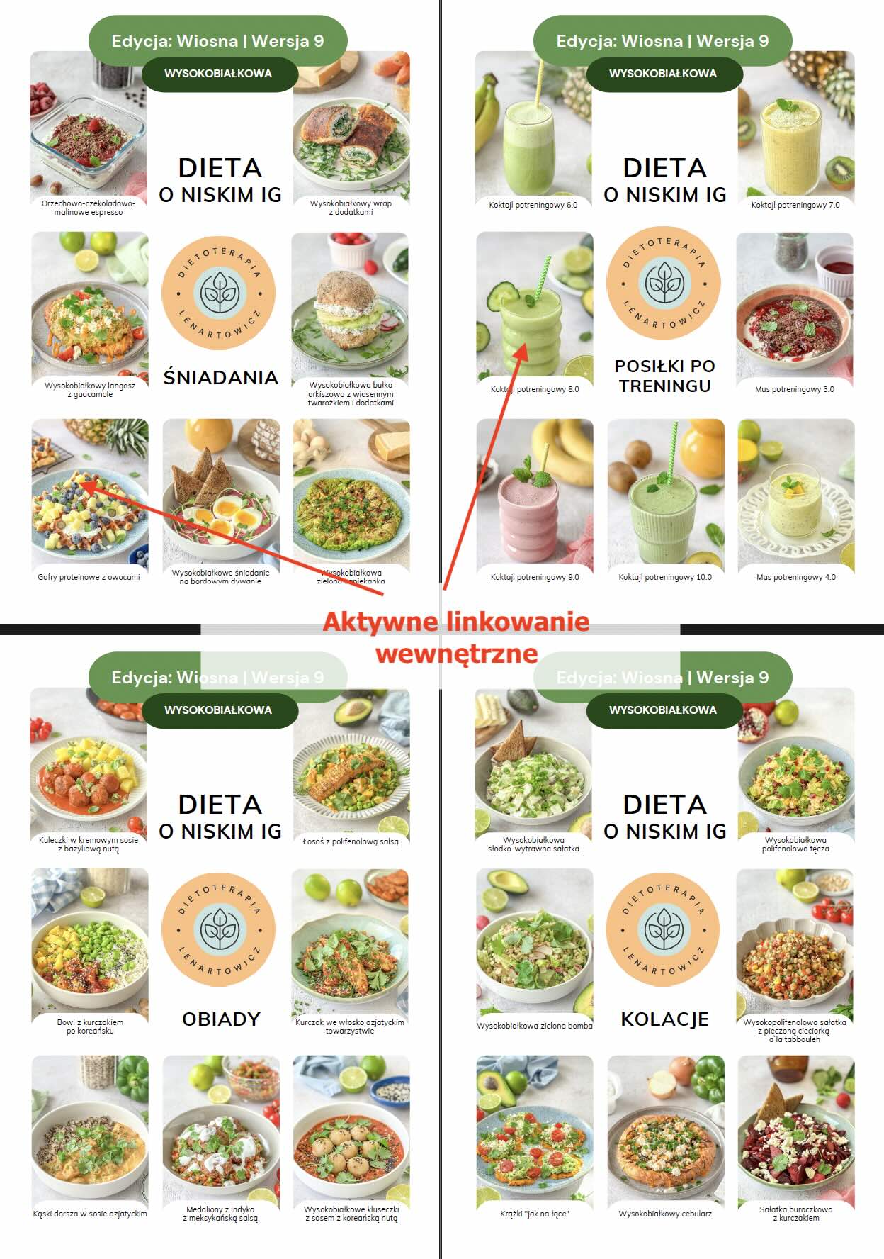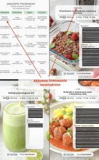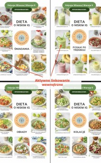 - 3 dzień - obiad bez mięsa, - MENU tygodniowe oraz ilustrowany spis potraw z aktywnym linkowaniem wewnętrznym powodującym, że po kliknięciu w nazwę potrawy czy zdjęcie następuje automatyczne przeniesienie do przepisu (nie trzeba przewijać),