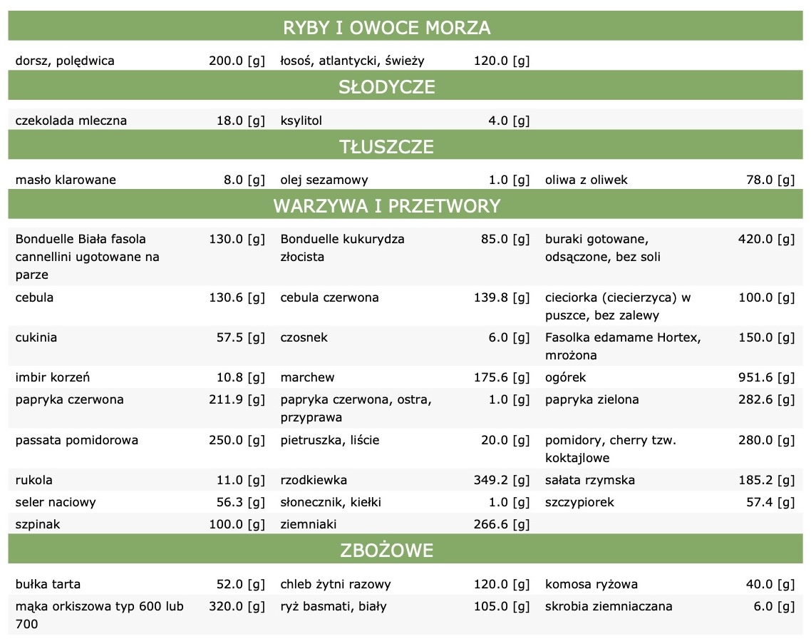 - informacje o gotowych produktach wykorzystanych w diecie,