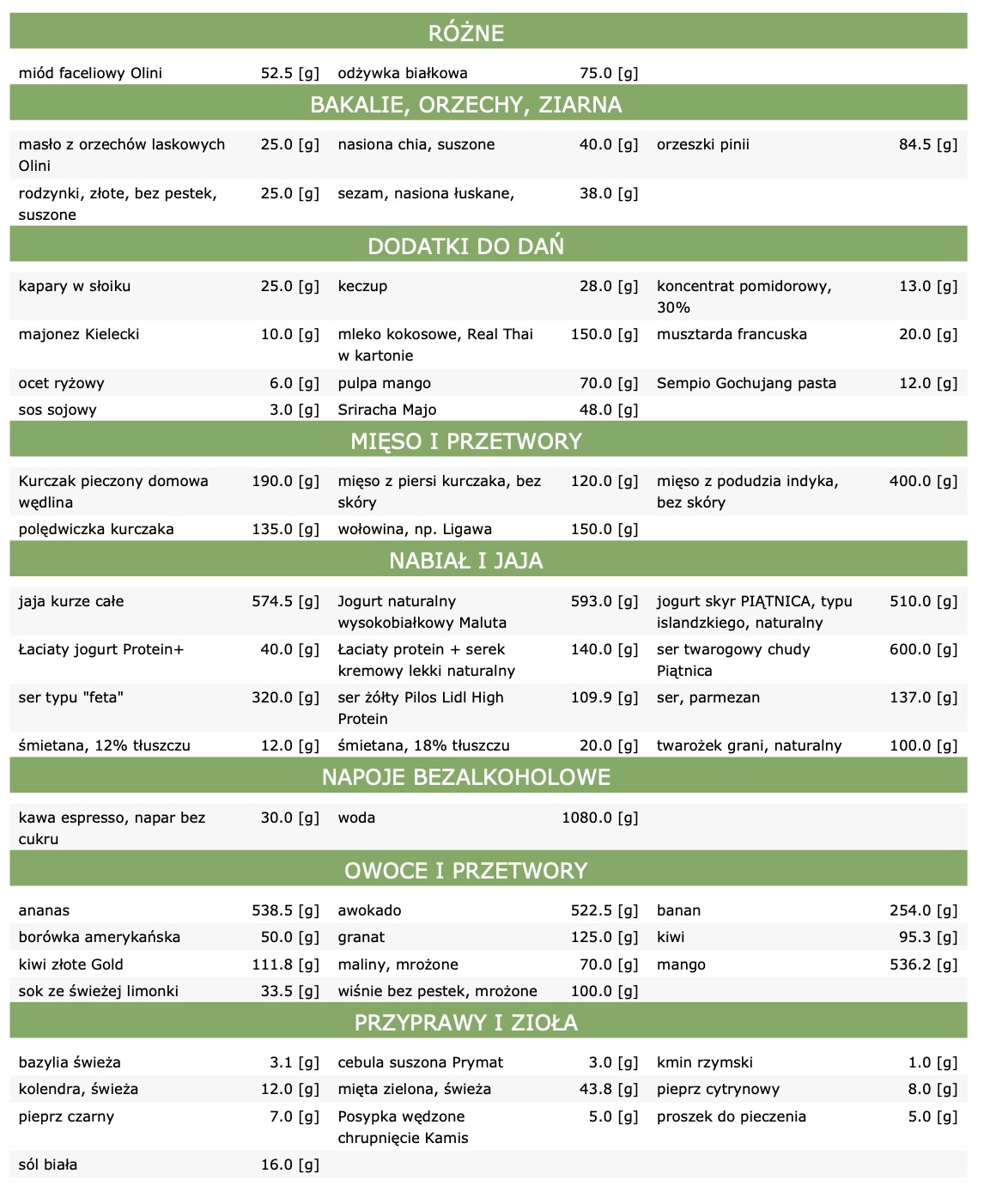 Rozkład makro: 30% białka, 35% tłuszczu, 35% węglowodanów.
