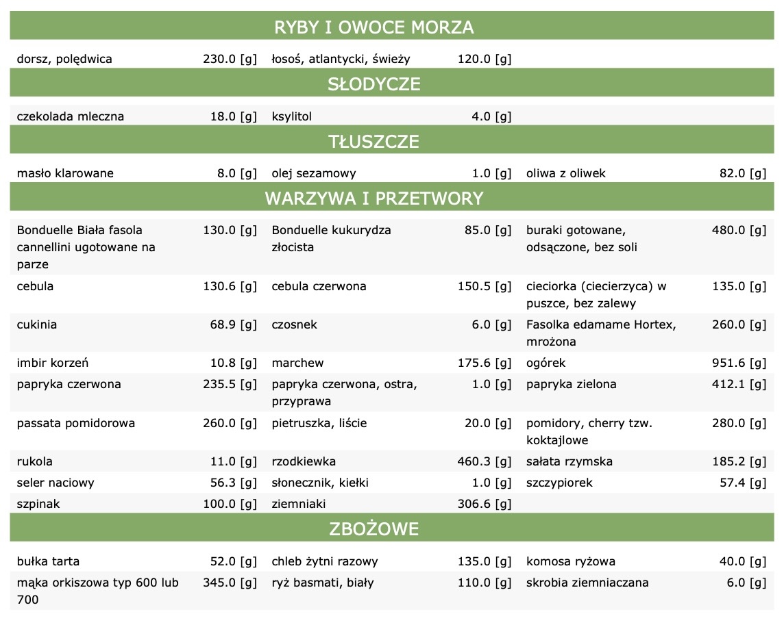 - informacje o gotowych produktach wykorzystanych w diecie,