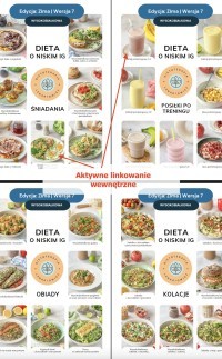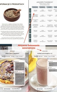 - 3 dzień - obiad bez mięsa, - MENU tygodniowe oraz ilustrowany spis potraw z aktywnym linkowaniem wewnętrznym powodującym, że po kliknięciu w nazwę potrawy czy zdjęcie następuje automatyczne przeniesienie do przepisu (nie trzeba przewijać),