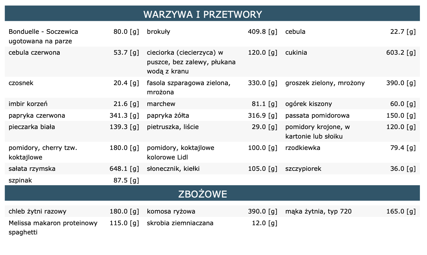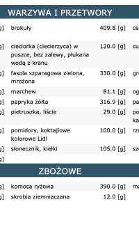 informacje o gotowych produktach wykorzystanych w diecie,