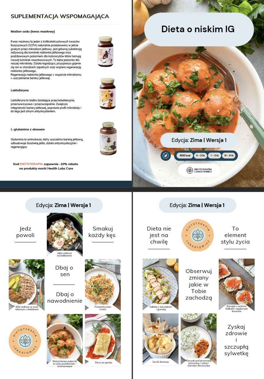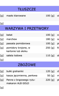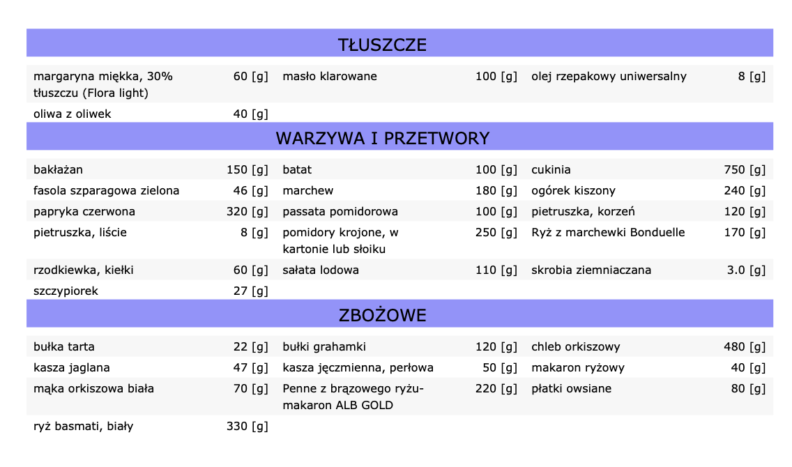 - przepisy na produkty wykorzystane w diecie do wytworzenia konkretnego dania,
