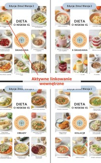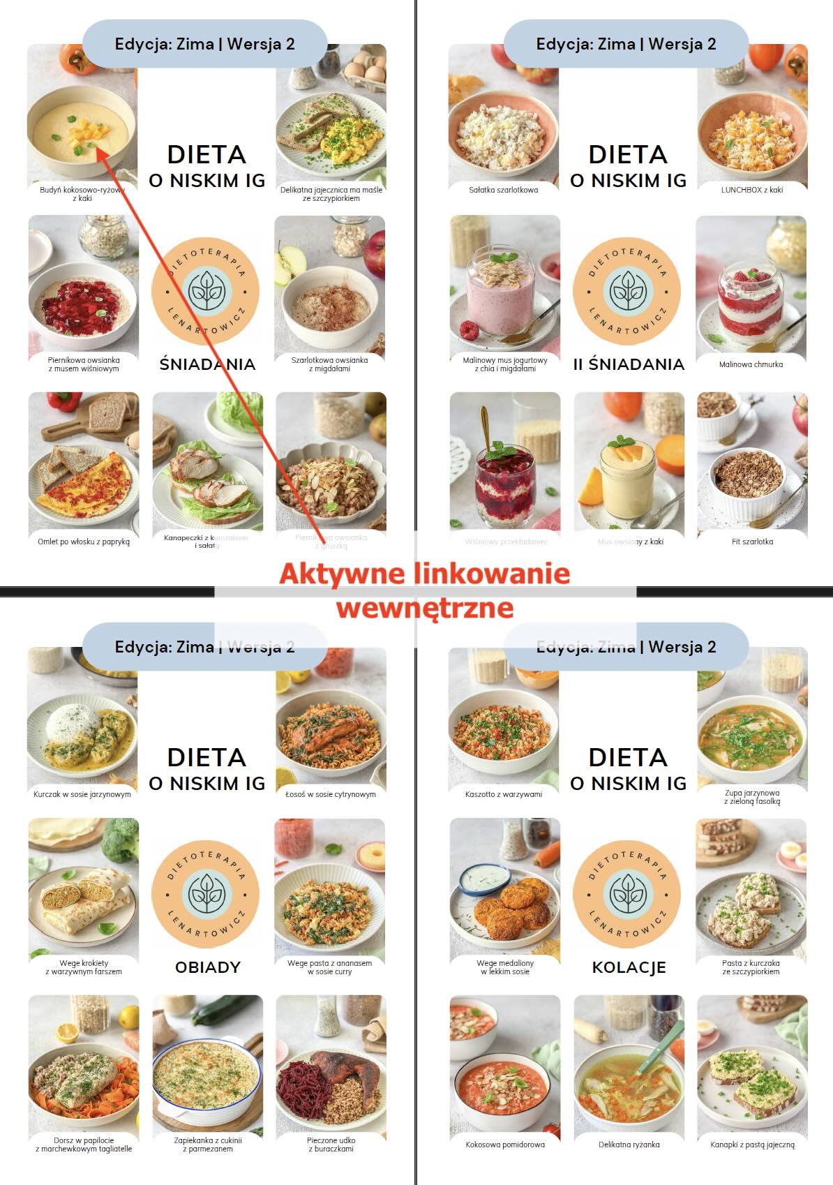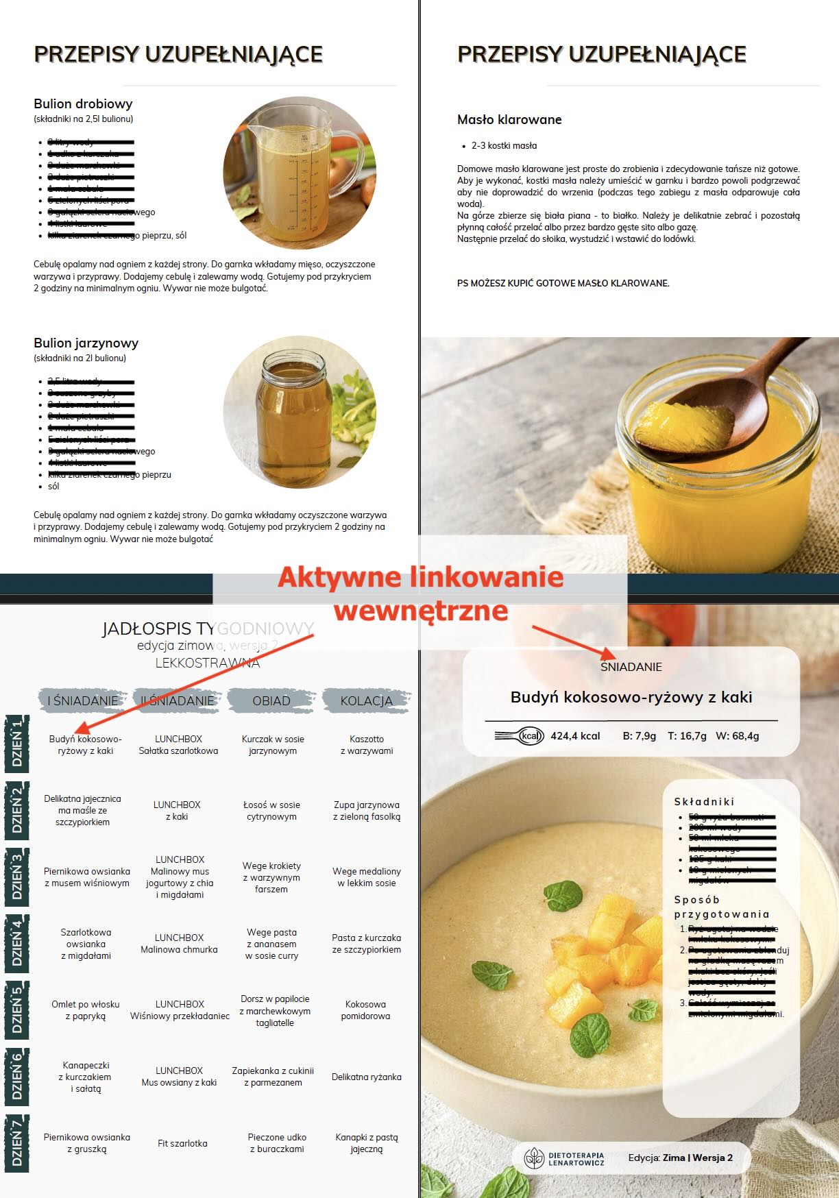 - MENU tygodniowe oraz ilustrowany spis potraw z aktywnym linkowaniem wewnętrznym powodującym, że po kliknięciu w nazwę potrawy czy zdjęcie następuje automatyczne przeniesienie do przepisu (nie trzeba scrollować),