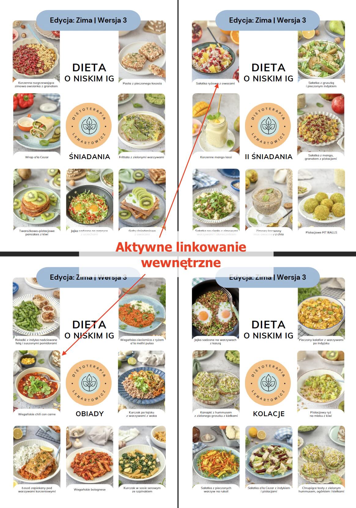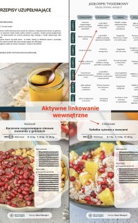 - MENU tygodniowe oraz ilustrowany spis potraw z aktywnym linkowaniem wewnętrznym powodującym, że po kliknięciu w nazwę potrawy czy zdjęcie następuje automatyczne przeniesienie do przepisu (nie trzeba scrollować),