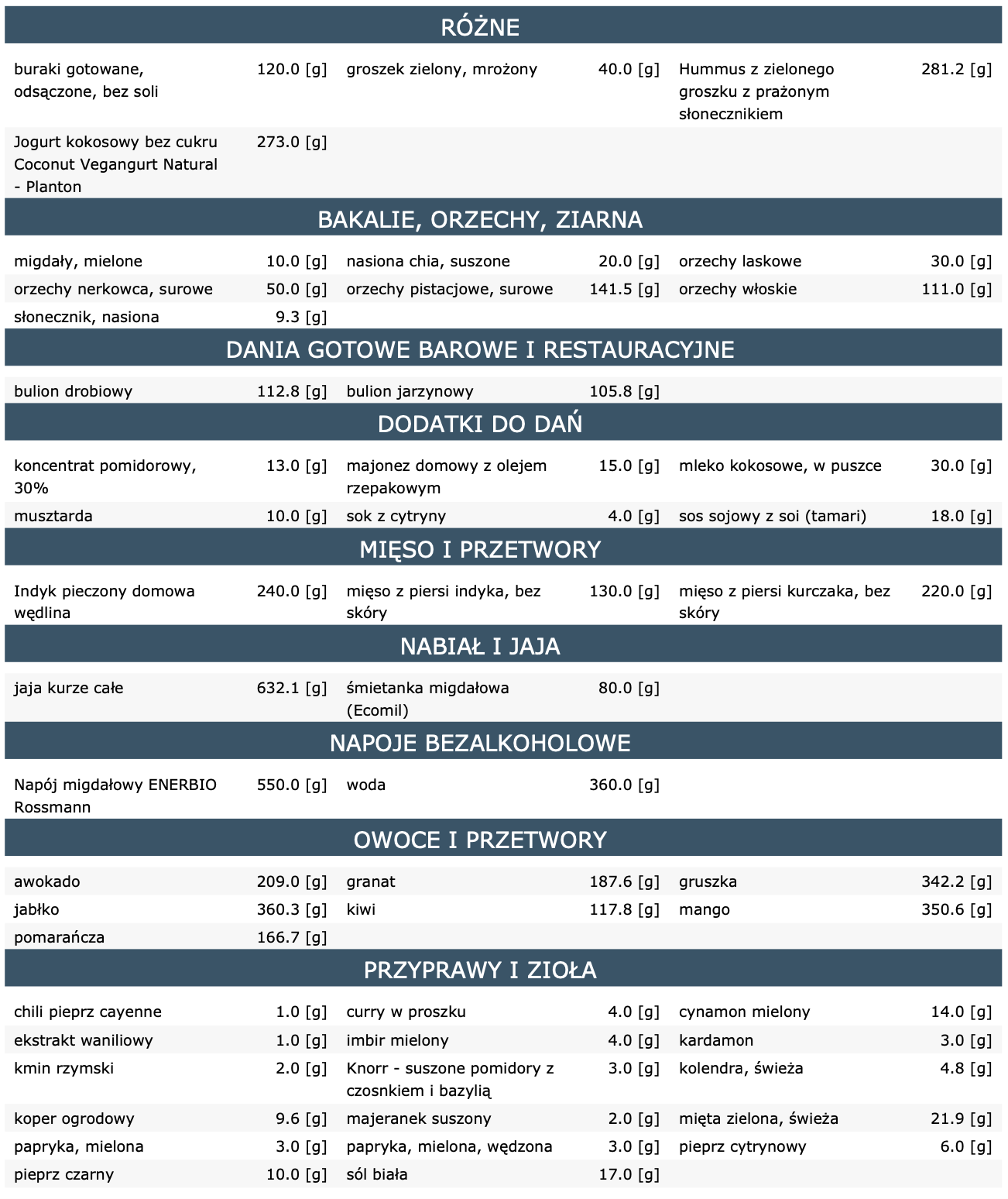 - makro składników użytych w przepisach dla osób chcących dokonać wymian.