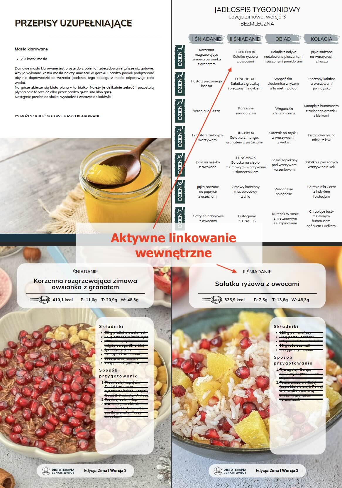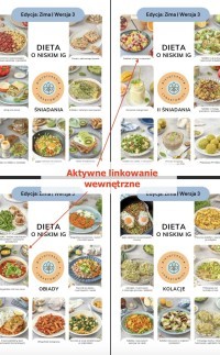 - MENU tygodniowe oraz ilustrowany spis potraw z aktywnym linkowaniem wewnętrznym powodującym, że po kliknięciu w nazwę potrawy czy zdjęcie następuje automatyczne przeniesienie do przepisu (nie trzeba scrollować),