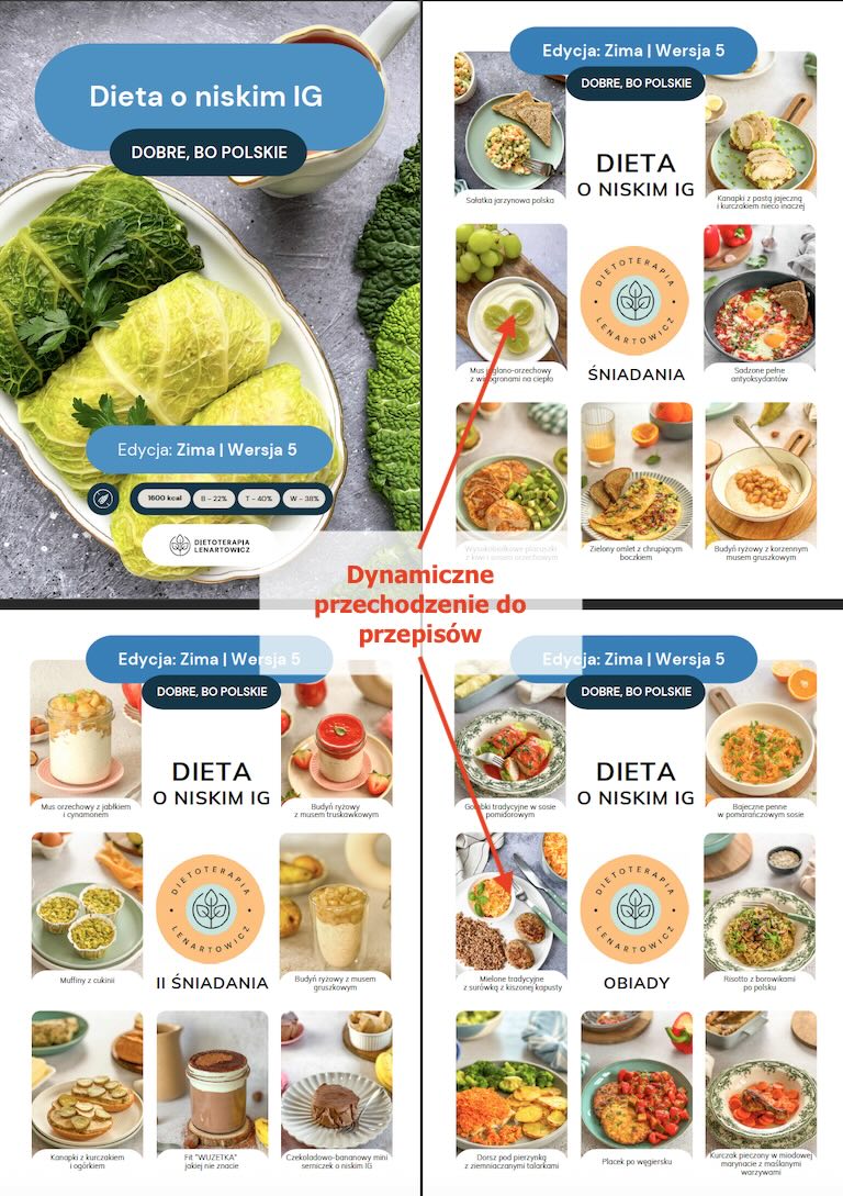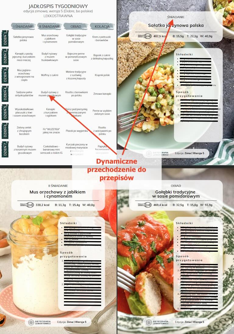MENU tygodniowe oraz ilustrowany spis potraw z aktywnym linkowaniem wewnętrznym powodującym, że po kliknięciu w nazwę potrawy czy zdjęcie następuje automatyczne przeniesienie do przepisu (nie trzeba scrollować),