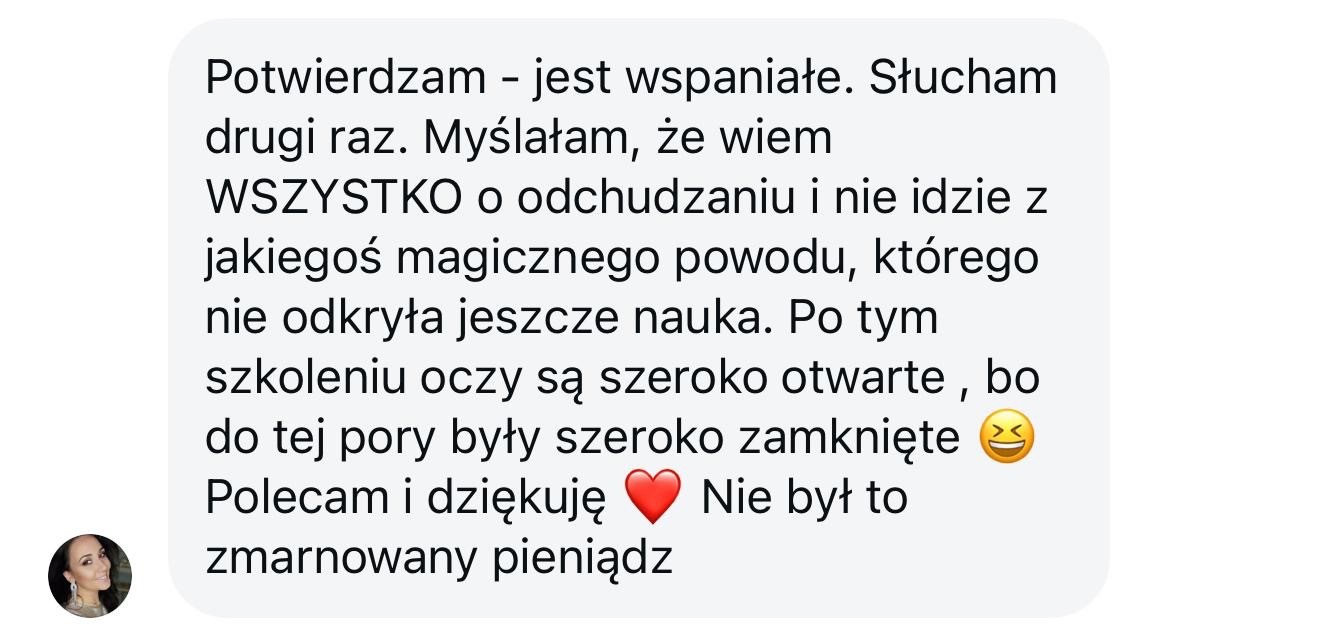 To szkolenie to ogrom wiedzy. Wydawało mi się że o odchudzaniu wiem wszystko, a jednak teraz widzę jakie popełniałam błędy. Mam w sobie spokój. Wierzę, że zmiany, które wprowadzę przyniosą efekty, już bez szarpania się, bez frustracji., bez "od poniedziałku", "od nowego roku". Polecam!