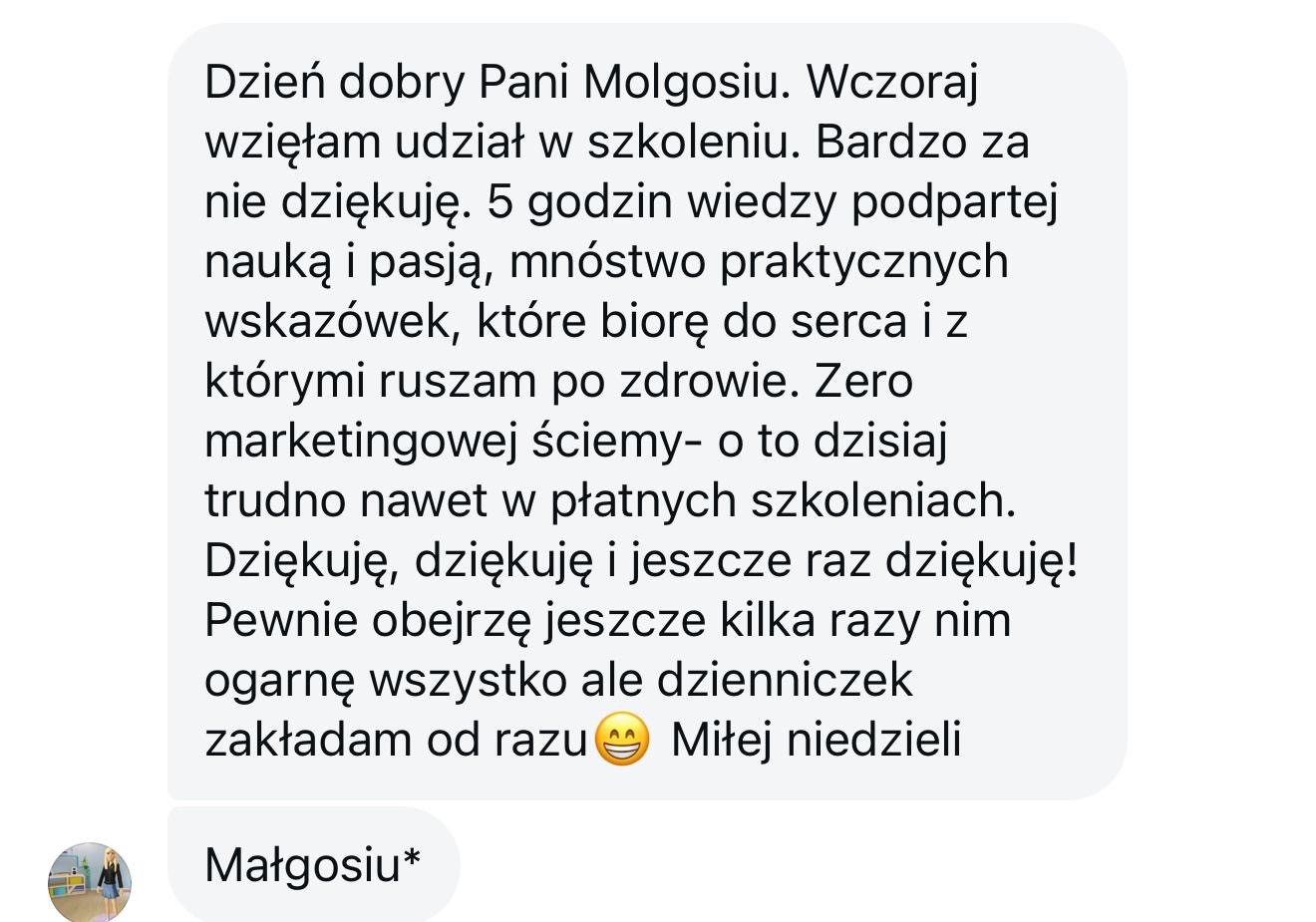 Szkolenie rewelacyjne, myślałam że nic mnie nie zaskoczy, Małgosia uświadomiła mi pewne zagadnienia, o których nie miałam pojęcia. Myślę że z takimi wskazówkami, wytłumaczeniem na przykładach jest szansa że może się udać, wiadomo że wszystko zależy od osoby która wprowadza zmiany w swoim życiu, ale z tą wiedzą jest to jak najbardziej do osiągnięcia. Małgosia tak wspaniale to wszystko tłumaczy. Bardzo polecam wszystkim.