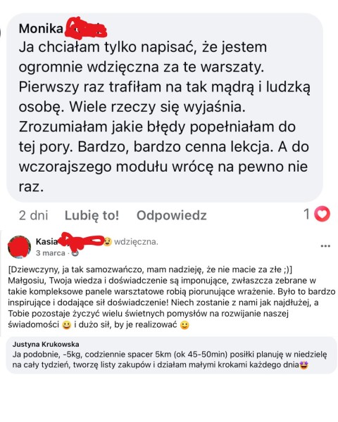 Uczestnicząc w warsztatach automatycznie stajesz się częścią społeczności kobiet, które mają podobne cele i wyzwania. Na grupie będziemy się wspólnie motywować, wspierać oraz dzielić doświadczeniami.